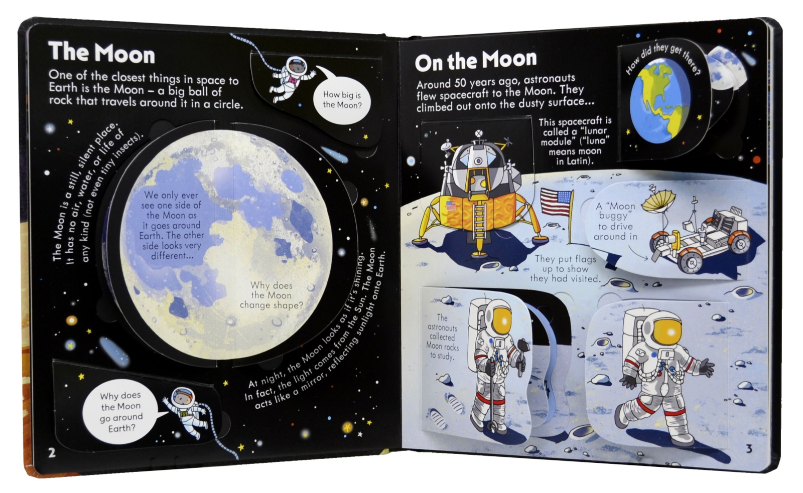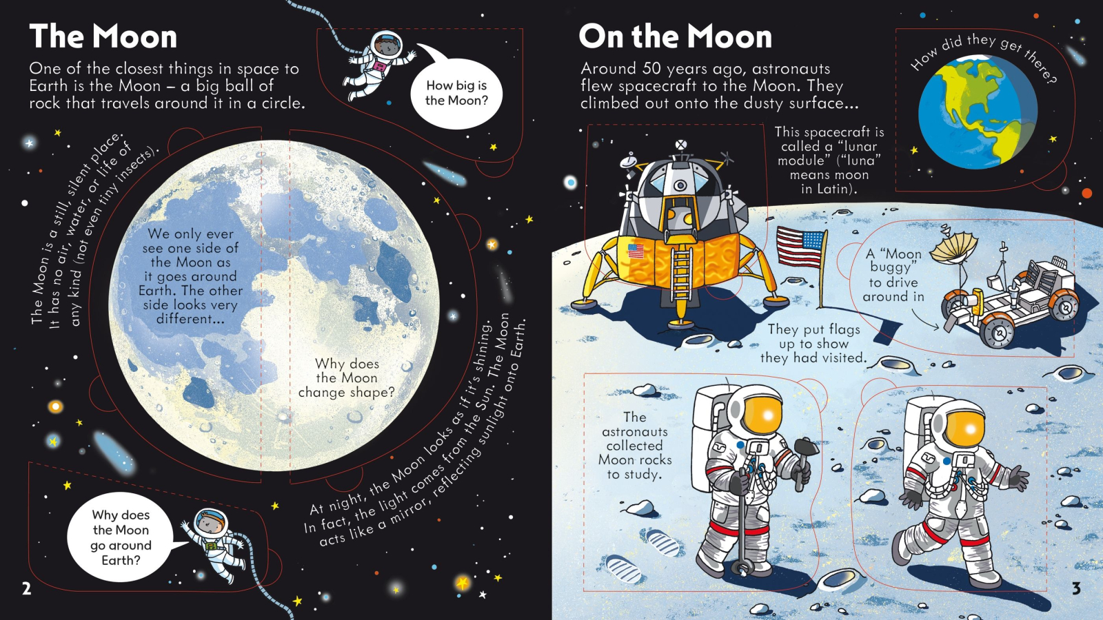 - Each double page covers a different topic, including 'Glittering galaxies', 'On the Moon' and 'Space Station'.
